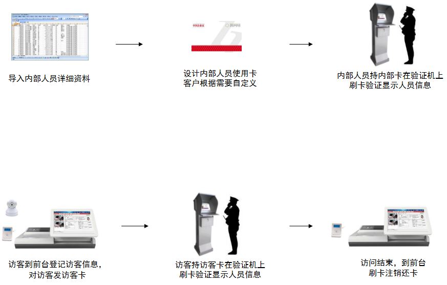 身份驗證機可與訪客機配合使用,訪客機為第一道安全保障,驗證機為第二道安全屏障,當訪客在訪客機上經過登記得到訪客卡之后,到二道崗相應的驗證機上進行驗證,驗證通過進入訪問,防止代登記情況發(fā)生,防止訪客進入與訪問區(qū)域無關的樓層或辦公樓,如卡片過期會提示“驗證失敗”。