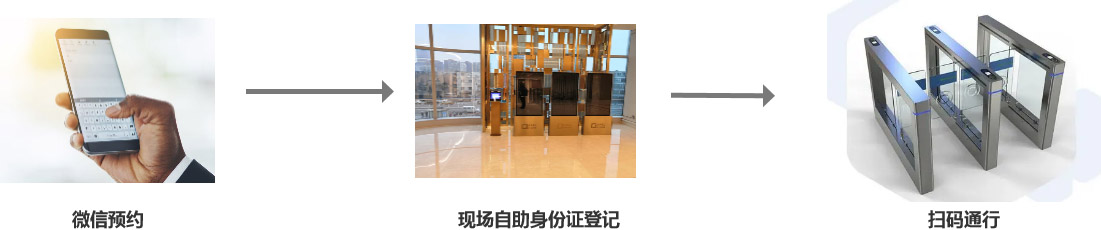 通過微信公眾號(hào)或辦公系統(tǒng)預(yù)約, 發(fā)送二維碼, 訪客在現(xiàn)場(chǎng)自助實(shí)名登記身份證